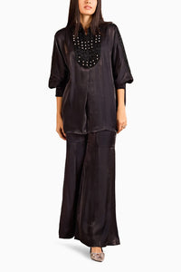 A black lame sharara set featuring eclectic beadwork and zircon detailing on the front yoke, along sholders and sleeves