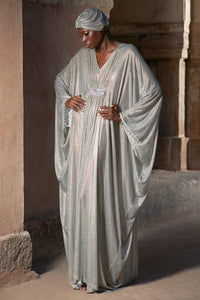 Silver with rainbow reflection full-length kaftan with gathered embroidery below the neckline and crystal droplet hanging detail on the cuffs, paired with a crepe slip along with a matching headgear accessory.
