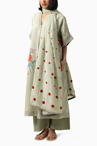 Zayne Dupatta in sea green, draped in a soothing sea green, is adorned with vibrant red towel embroidered polka dots, featuring elegant red fine chanderi piping.