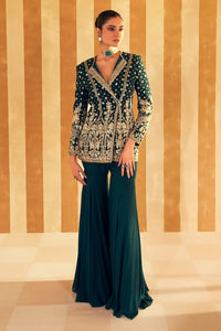 Elevate your style with our Emerald Green Pant Suit and Jacket Set, a stunning ensemble that exudes sophistication and luxury. Crafted from exquisite Georgette fabric, this set features a captivating V Neck intricately adorned with opulent gold embroidery, sparkling crystals, and delicate threadwork showcasing a delightful mix of floral motifs. The unique jacket silhouette, reminiscent of a suit or blazer, adds a touch of modern elegance to this traditional outfit. Paired elegantly with a Net Dupatta, this ensemble is a testament to the richness of both color and silhouette, making it a standout choice for special occasions. Step into the spotlight with this resplendent Pant Suit and Jacket Set, designed to make you feel like royalty with its luxurious appeal.
