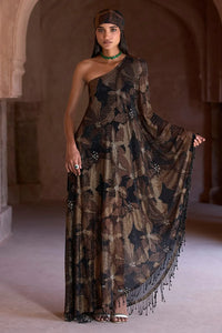 One-shoulder black and gold floral full-length kaftan with crystal droplet embellishment on the hem along with a matching headgear accessory.