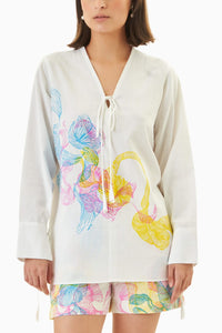 This relaxed-fit shirt combines effortless style with meticulous craftsmanship. Made from a light-reactive linen and cotton weave, the shirt features a V neckline and buttons down the front, offering a classic yet modern look. The design includes a double-layered yoke with a pleat at the back, adding subtle sophistication and ease of movement. The long sleeves are extra loose and finished with strap-detailed cuffs for a unique touch, while the rounded hem adds a flattering silhouette with a slightly longer back for added coverage. Paired with shorts, this shirt offers a chic, laid-back ensemble perfect for warm weather or casual outings, enhanced by its hand-screen printed design that ensures each piece is uniquely yours.