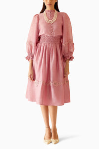 Introducing the Zenia midi dress—a stunning blend of femininity and elegance. Crafted from 100% silk linen, this dress features a cinched waist and exquisite floral lace detailing adorned with stones and beads, perfect for elevated occasions. The midi length and front button closure complete this refined and graceful ensemble.