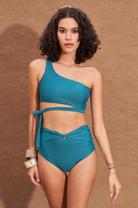 Introducing the Nura One Shoulder Top paired with our stylish Bikini Bottom. Crafted from luxurious Italian fabric, the top offers sculpting comfort with a chic one-shoulder design and a trendy side tie closure. The coordinating Bikini Bottom features a twist front and high waist for full coverage, ensuring a flattering fit. Together, this set combines elegance and comfort, perfect for beach days or poolside lounging!