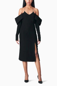 The not-so-classic cocktail dress. Crafted in exquisite quality polyester and lined with silk, this mid-calf dress features a flattering V-neckline, contoured fit, a side slit, back zip closure, and masterfully constructed statement sleeves.