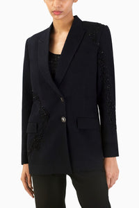 28 Moons imagined minimalist double-breasted jacket with intricate hand embellishment on pure pashmina and lined in contrast fuchsia dusk silk. Features embellished textured surface-design flowing seamlessly through the jacket. Engineered in hand-made pashmina and lined in fluid silk, the jacket is designed to be ultra lightweight and warm. The melting metallic buttons accents the front. Features precise tailoring and hand sewn construction techniques.