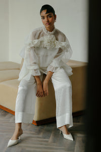 Featuring the Zest Organza Co-ord Set by Trisara's Fuss Over Me Collection. This off-white organza set includes a high-neck top with ruffles and frills, offering a straight-fit silhouette that combines elegance with a touch of dramatic flair.