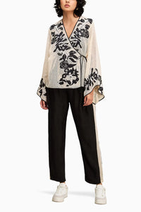 The Off-White Applique Short Angarkha Top in handloom cotton features intricate applique embroidery, offering a blend of traditional craftsmanship and contemporary style. It comes with a slip for added comfort and is paired with black flared pants in linen slub cotton, creating a chic and balanced ensemble perfect for any occasion.