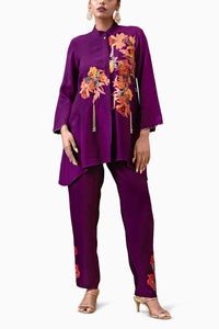 The Purple Zinnia Applique Kurta features stunning floral applique work with flared sleeves, creating a graceful and elegant look. Paired with matching pants in luxurious Chanderi fabric, this ensemble offers both comfort and sophistication. Perfect for festive or semi-formal occasions, it combines traditional craftsmanship with modern design for a chic, timeless appearance.