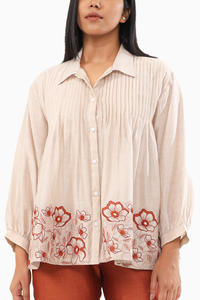 Introducing the Chanderi silk top, featuring refined pintuck detailing on the yoke that adds a touch of elegance. Intricate threadwork and delicate appliqué around the hemline enhance its timeless appeal, making it a standout piece in any wardrobe. Perfect for elevating both everyday and special occasion outfits, this top combines classic craftsmanship with sophisticated design.