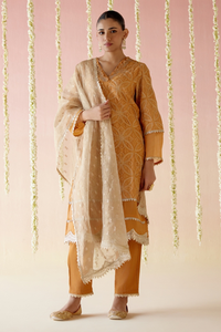 This elegant three-piece set includes a Kurta, Pant, and Dupatta. The Kurta features delicate zari work and intricate lace detailing, adding a touch of sophistication. Paired with narrow pants and a coordinating Dupatta adorned with lace, the ensemble is completed with style. Crafted from fine, luxurious fabric, this set ensures all-day comfort and refinement.