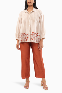 Fabric- Chanderi Silk Color- Off White and Rust Details- Pintuck Detailing and Thread Embroidery Fit- Regular Fit Components- 2 Product Code- SVEORIGWF-24-2CO-RU