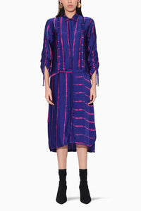 This versatile shirtdress showcases a mix of panels adorned with hand-done shibori stripes, blending traditional craftsmanship with modern design. The unique pattern and structured fit make it a standout piece for both casual and dressier occasions.