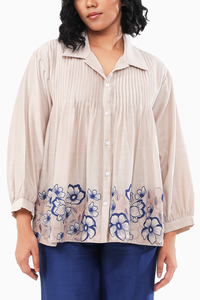 Featuring luxurious Chanderi silk, this top exemplifies timeless elegance with its refined pintuck detailing on the yoke. The delicate pintucks add a subtle texture that enhances the overall sophistication of the design. Complementing this are intricate threadwork and appliqué around the hemline, which further elevate the top's classic charm with their meticulous craftsmanship and artistic flair. This combination of elegant detailing and high-quality fabric makes the top a standout piece in any wardrobe.