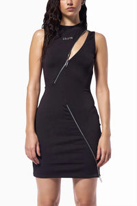 This sleek lycra jersey dress features striking asymmetric zipper details, adding a bold and modern edge. The bodycon fit hugs your curves, while the sleeveless design offers a chic, minimalist look. Made from high-quality lycra jersey, this black dress combines both comfort and style.