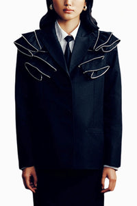 Classic tailored meets eclectic styling with this oversized blazer, featured in a premium suiting fabric and adorned with zipper traced suiting ruffles at the front.