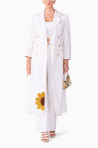Step out in style with the Zoa White Denim Trench Dress, complete with a fitted bralette and flared pants. This chic double-breasted trench features stunning 3D floral applique embroidery, a detachable wooden buckle belt, and stylish wooden buttons. The contrast piping and front pockets enhance its modern look, while the frayed hemline adds a trendy touch. The accompanying white bralette offers adjustable straps, a back elasticated design, and a side zipper for a perfect fit. Paired with full-length flared pants made from stretchable denim, which includes a back elasticated waistband and side pockets, this ensemble effortlessly combines comfort and sophistication for any occasion.
