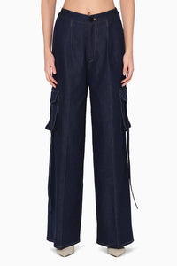 These super comfortable denim cargo trousers feature statement pocket details, combining style with functionality. The roomy fit and sturdy fabric offer ease and versatility, while the oversized pockets add a bold, utilitarian touch, making them both practical and fashion-forward.