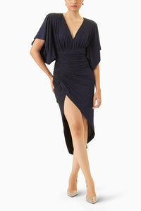 Featuring  Zoe Midnight Blue Dress by Kangana Trehan. This scintillating dress is made with a shimmer jersey fabric and features all things glamourous - flared sleeves, an asymmetrical hemline and a cinched waste.