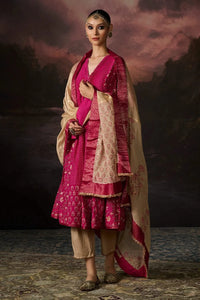 Featuring the Zoya Rani Pink Kurta Set by Swatti Kapoor’s Firdaus collection. This handwoven Chanderi kurta with 100% cotton slip and pants is paired with a matching dupatta featuring a zari stripe border. It showcases hand embroidery in vibrant rani pink and gold hues with a regular fit.