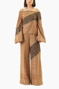 When creating a collection inspired by wildlife, the beloved Cheetah is one of the first creatures that comes to mind. Our love for the Cheetah grew from a visit to the Masai Mara National Reserve in Kenya, where we witnessed the exquisite big cats in their natural habitat. The khadi pants and balloon- sleeved top feature embroidered spotted patches with fringed detailing.